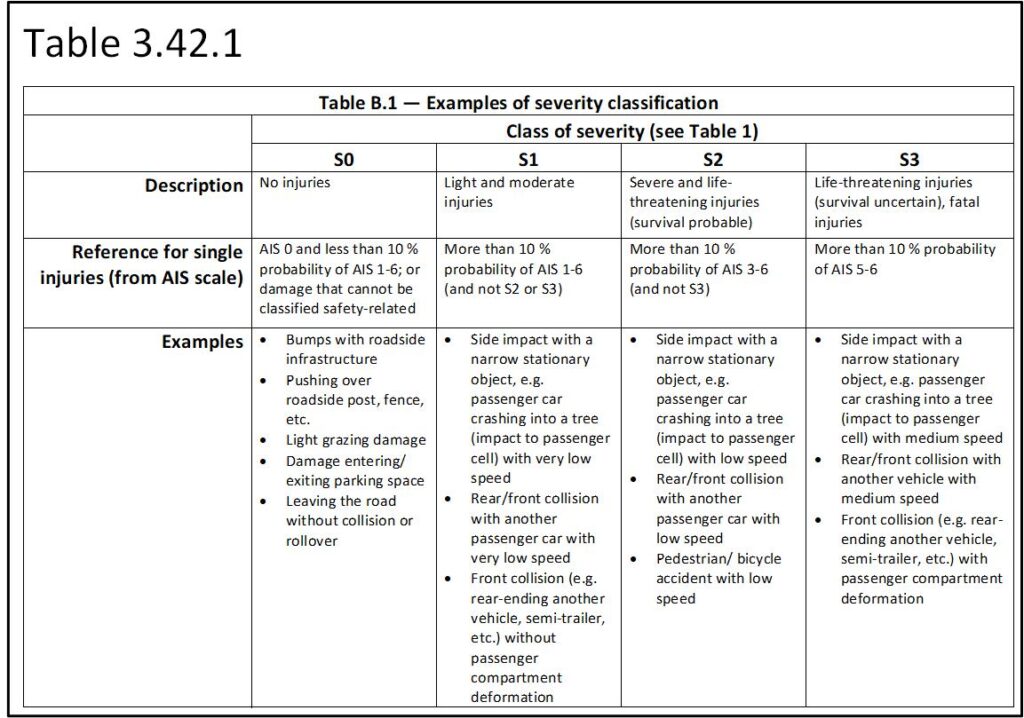 ISO 26262 Part 3-6.4.3.2 The severity of potential harm will be estimated based on a defined rationale for each hazardous event. The severity will be assigned to one of the severity classes S3, S2, S1 or S0 in accordance with Table 1 (Table 3.42 and 3.42.1). If the probability of a critical injury or death (AIS 5 or 6 – Table 3.42.2) is 10% or greater, severity is S3. If the probability of significant injury of AIS 4-6 is 10% or greater but not an S3, severity is an S2. If the probability of an AIS 1-6 injury is greater than 10% but not an S2, severity is an S1. Anything less, including only property damage, is an S0. This produces a more objective level of severity risk.