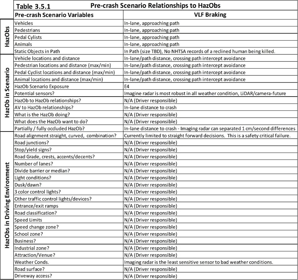 Table 3.5 is a general table that can be used. It relates all VLFs to potential HazObs. It has three sections of rows. The expected HazObs that are included in the representative road segment are documented. The HazOb exposure in the ODD is determined by the representative road segments. The quantity of each HazOb category in the driving segment at different times of day are the exposure to pre-crash scenario. The HazOb locations, relative position and trajectory compared with the AV as it drives is the specific exposure to front, side, turning, stopping and reverse pre-crash scenario.