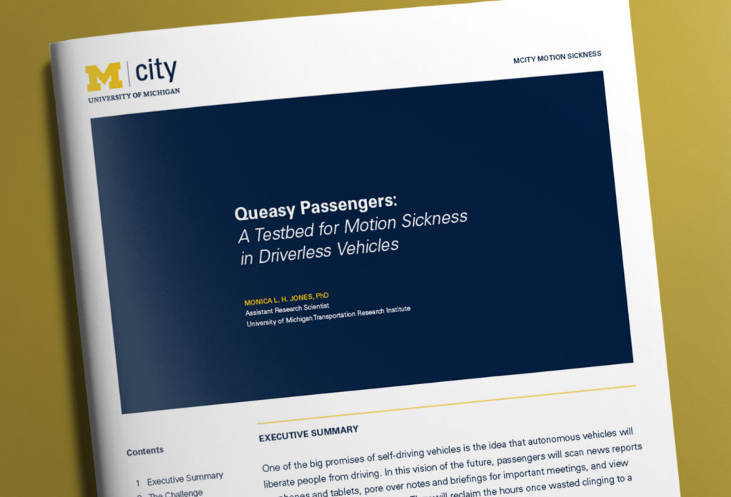 “One of the great promises of AVs – to give us back time by freeing us from driving – is at risk if we can’t solve the motion sickness problem,” says Monica Jones, an assistant research scientist in the Biosciences Group at the University of Michigan Transportation Research Institute (UMTRI). “If it’s not mitigated in some way, motion sickness may affect people’s willingness to adopt driverless cars.”