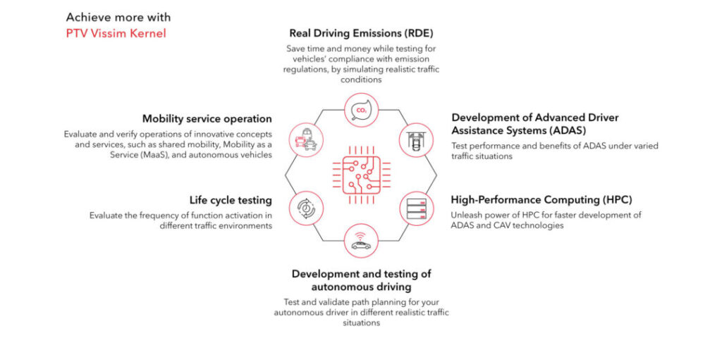 Vissim Kernel is a subscription-based service that supports HPC (high power computing) and is capable of working with existing systems and other simulation tools, including IPG Automotive’s CarMaker or Hexagon/MSC’s VTD (Virtual Test Drive). The company notes this cross-program integration enables a virtual environment in which a multitude of simulations can run alongside one another.