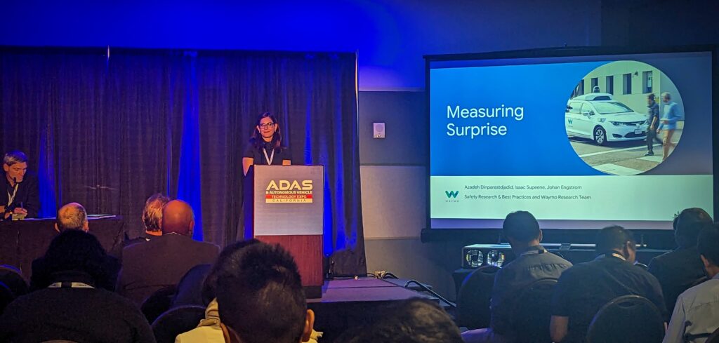 One of the highlights from the conference (rates apply) at ADAS & Autonomous Vehicle Technology Expo California was a presentation from Azadeh Dinparastdjadid, a senior research scientist on the Safety Research and Best Practices team at Waymo, discussing how to measure surprising road user behavior.