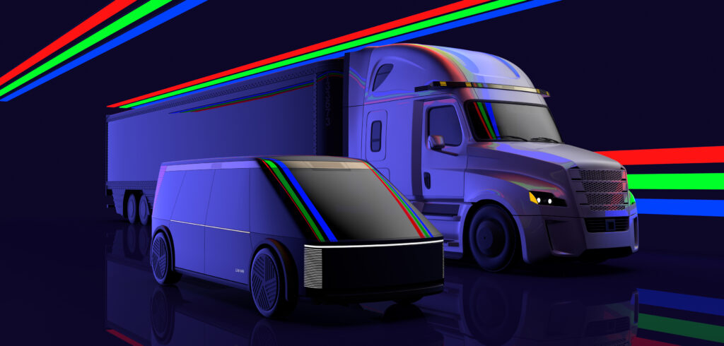 The robotaxi centered around a roomy and inspiring car design for autonomous operation on highways and in urban environments. The ‘blade’ runs down the centerline of the roof, incorporating four lidar units to provide 360° coverage. The truck concept featured a three-lidar setup to provide long-range coverage and the ability to be retrofitted to existing class 8 trucks.