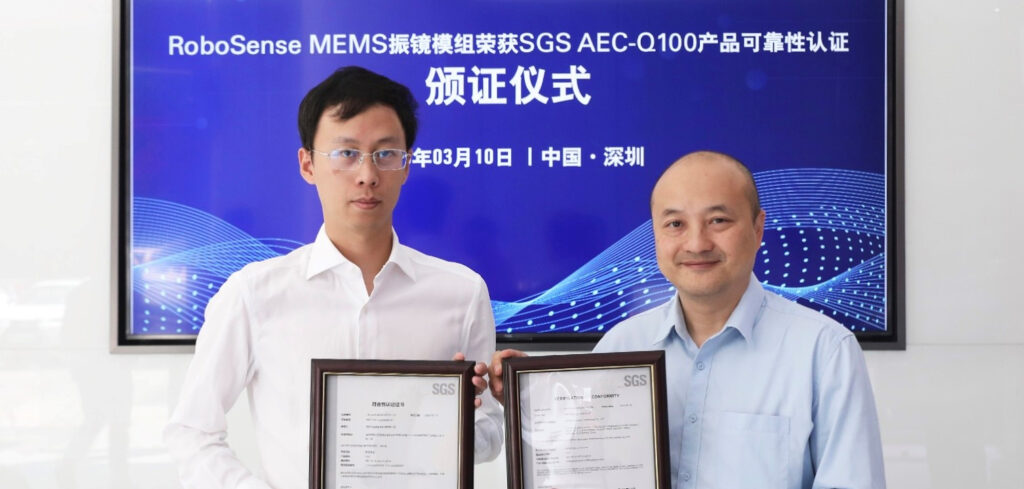 “Achieving AEC-Q100 certification of RoboSense M Series lidar MEMS chip module is the first complete testing of scanners for automotive reliability in the lidar industry worldwide,” explained Zhao Hui, general manager of SGS China Interconnection and Products Business Group. “This not only increases the competitiveness of M Series lidar products, but also sets a new benchmark for mass adoption of lidars in the automotive industry. Going forward, SGS will continue to support RoboSense in reliability testing and verification of lidar products to facilitate global progress in the lidar industry.”