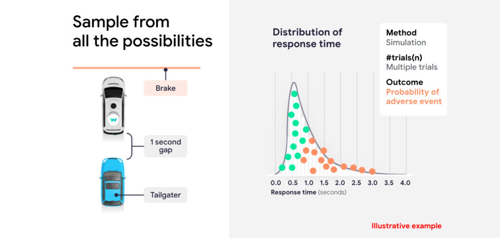 The company also wants to understand how its system reacts to the full distribution of behaviors it will encounter in the real world. It gives the example of a tailgating scenario at an intersection. It wants to understand as many various outcomes as possible and their likelihood to happen to evaluate the Waymo Driver’s behavior. If a random tailgating scenario were to be picked, the chances are the tailgater would brake in time. But how would the Waymo Driver behave if the tailgater doesn’t brake in time, such as when that driver is distracted or inattentive? It notes that with ever more variations of the same scenario, a convergence of the distribution of outcomes between what is observed in simulation and the real world starts to be realized.